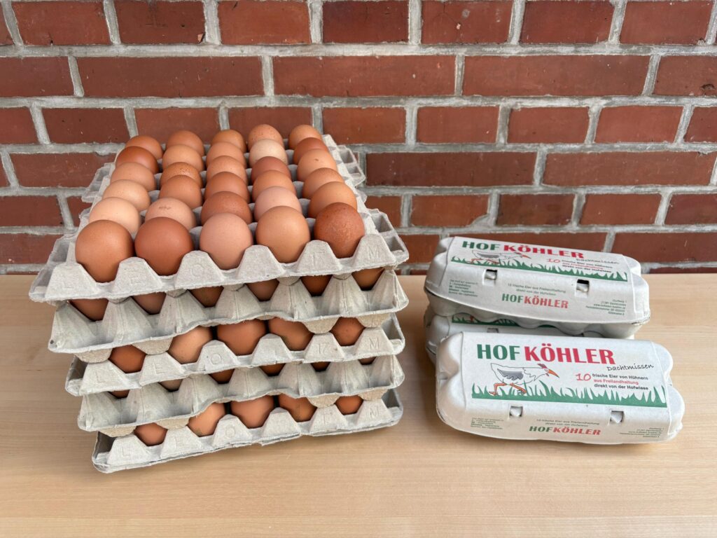 Unsere Legehennen leben in Freilandhaltung. Die Eier werden mit einer Sortiermaschine in die Größen S, M, L und XL sortiert, sodass jeder selbst entscheiden kann, welches Ei er am liebsten mag.